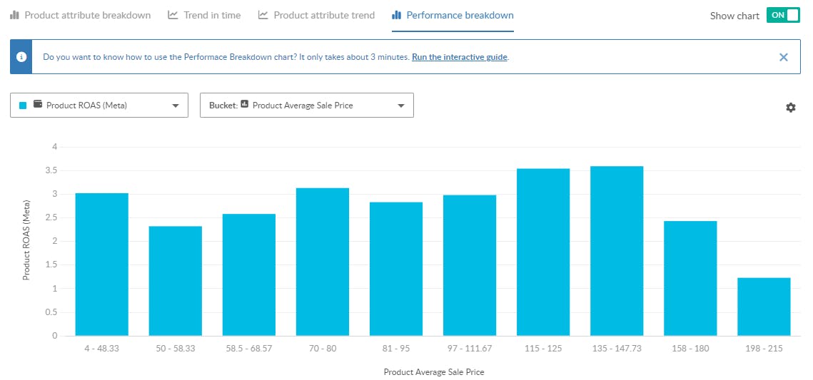 Selecting average sale price as a bucketed metric reveals that more expensive products are not promoted much. By changing spend to Product ROAS, the profitability of individual price buckets is apparent.